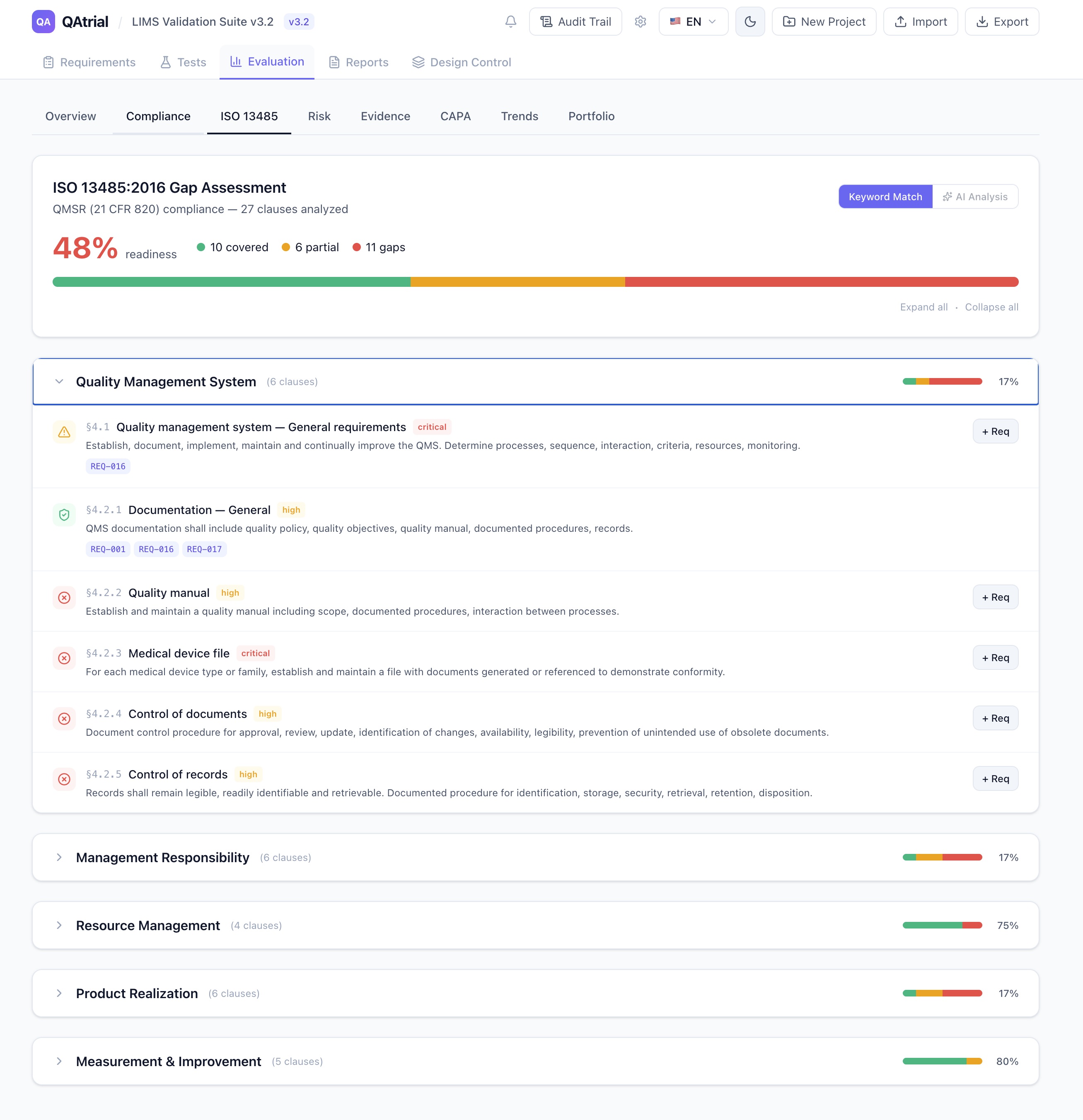 Claude models excel at regulatory precision and structured output. When QAtrial asks Claude to perform a gap analysis against ISO 13485 clauses, the response consistently follows the expected schema with evidence citations and actionable recommendations. The 0.2 temperature setting means Claude prioritizes accuracy over creativity — which is exactly what you want when the output feeds into a compliance report.