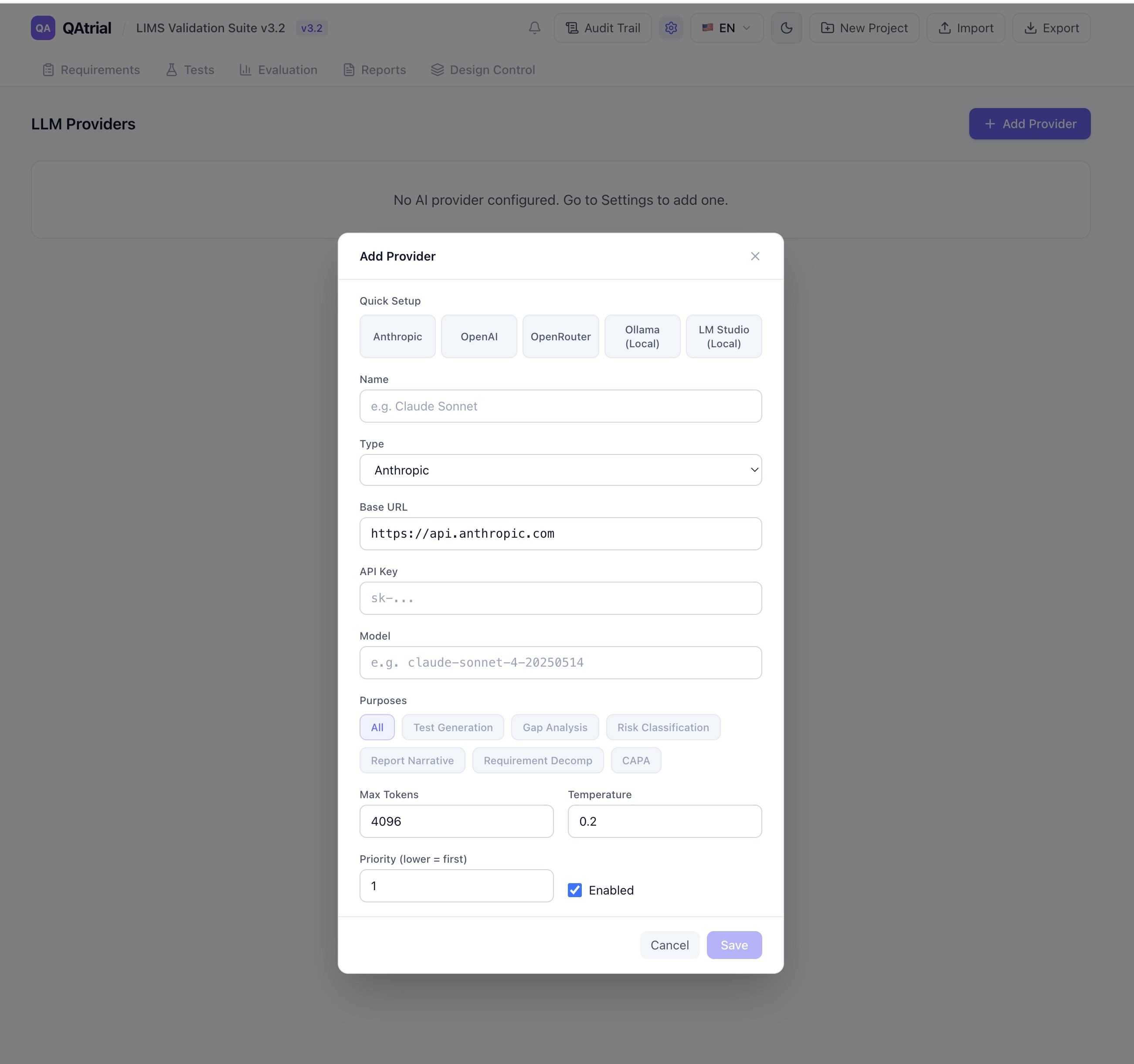 Each provider has a purpose selector with seven options: All, Test Generation, Gap Analysis, Risk Classification, Report Narrative, Requirement Decomposition, and CAPA. Providers also have a priority setting (lower number = higher priority), so if your primary provider is unavailable, QAtrial falls back to the next one.