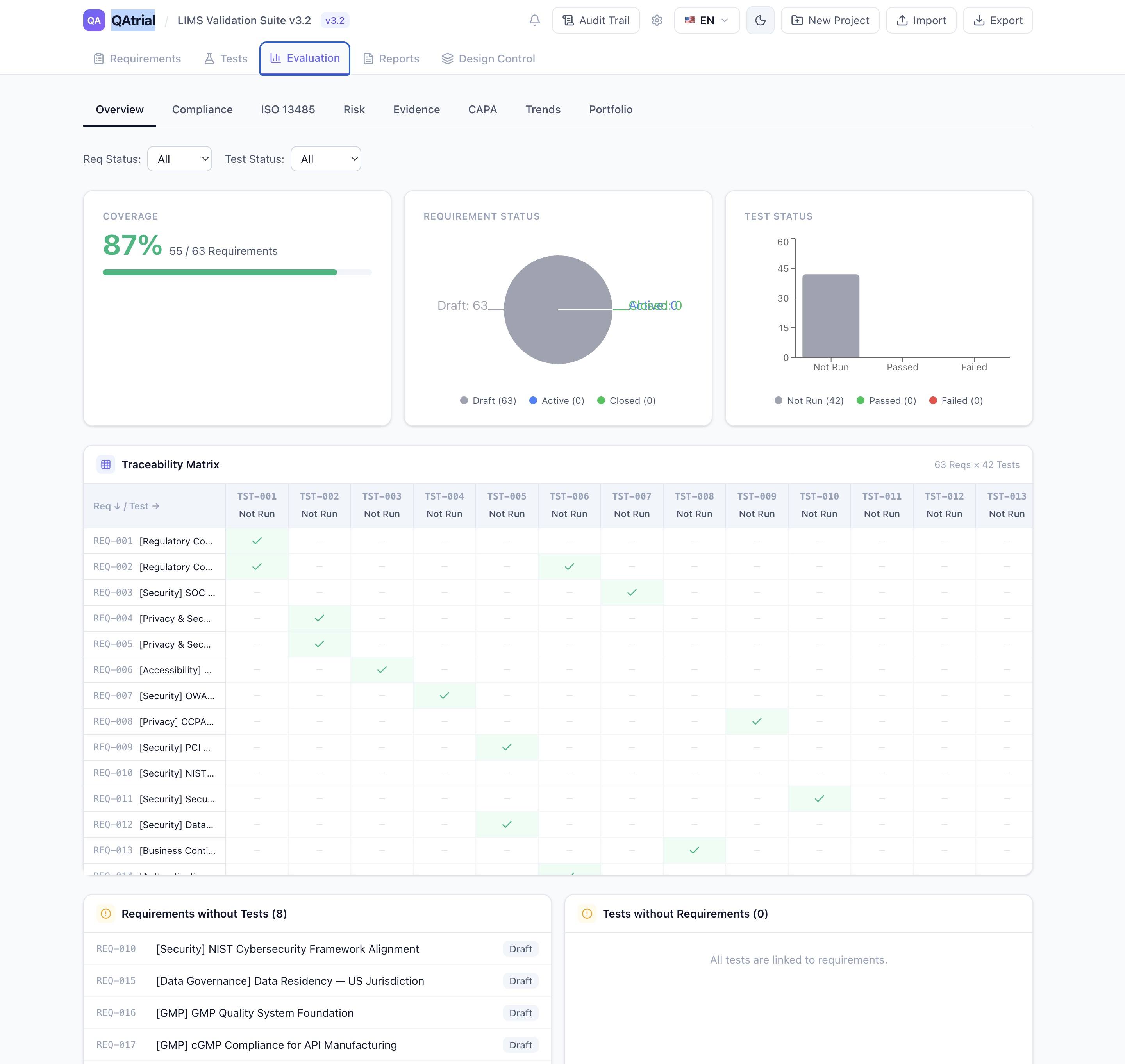 The AI features are the same regardless of provider. The gap analysis prompt, the test generation logic, the risk classification framework — all of it works identically whether the backend is Claude Opus 4 running on Anthropic’s servers or Llama 3.1 70B running on a GPU in your server room.