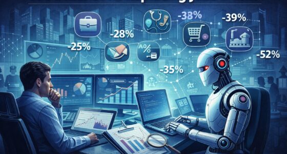 AI is rapidly transforming professions like law and medicine, making even highly skilled roles vulnerable to automation. Tasks once done manually, like legal research or diagnostics, are now handled by intelligent tools, reducing the need for entry-level roles and changing career paths. To stay relevant, you’ll need to develop new skills, focus on problem-solving, and adapt as technology reshapes your industry. Keep going to discover how to navigate these shifts effectively.