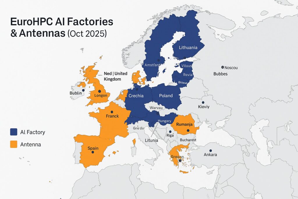 Just three days later, on October 13, EuroHPC and the European Commission jointly unveiled 13 AI Factory Antennas — lighter, interoperable nodes connecting local innovation ecosystems in Belgium, Cyprus, Hungary, Ireland, Latvia, Malta, Slovakia, and partner nations such as Iceland and the United Kingdom.