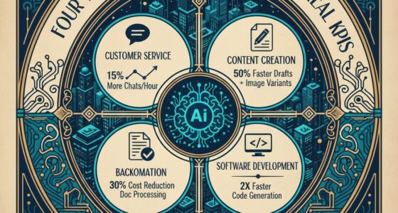 You measure ROI from generative AI projects by tracking key metrics like cost savings, time reductions, and revenue growth. You compare pre- and post-implementation performance, analyze improvements in customer satisfaction, and evaluate efficiency gains. You also consider strategic benefits such as enhanced innovation and competitive advantage. By setting clear goals and monitoring these indicators regularly, you gain an extensive view of how your AI investments translate into tangible business value.