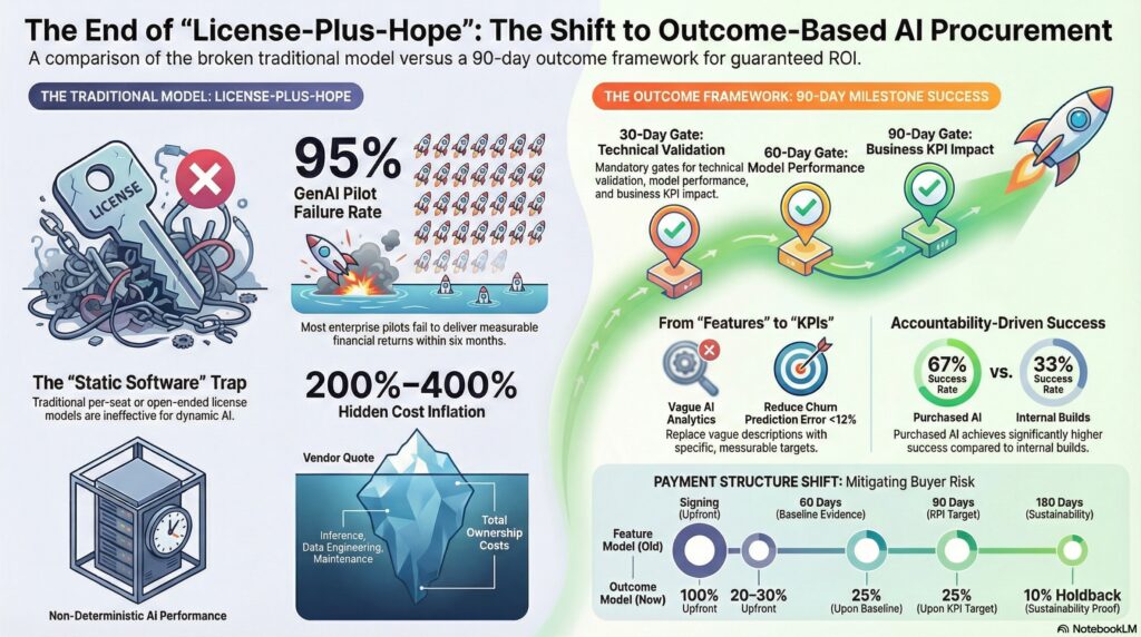 The procurement model that created these outcomes — license-plus-hope, seat-based pricing, open-ended “transformation” mandates — was designed for static software, not for systems that degrade, hallucinate, and require continuous recalibration. Every failed AI project that passed through a traditional procurement gate is evidence that the contract, not just the technology, needs to change.