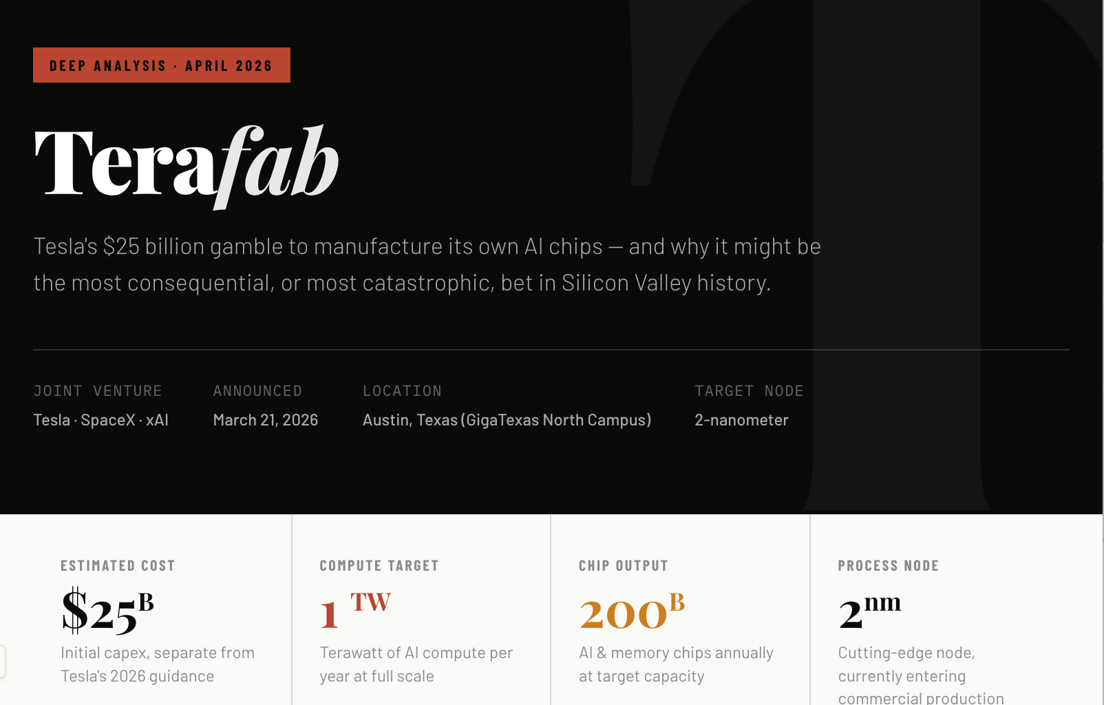 The most realistic near-term outcome is a functional prototype facility at GigaTexas that validates the iteration-loop thesis and produces AI5 chips in small volumes, while the full-scale 1-terawatt vision remains a multi-decade, multi-company infrastructure program. That alone — a working advanced fab producing Tesla’s own silicon — would still constitute one of the most significant industrial achievements of the 2020s. Whether it arrives on Musk’s timeline, on anyone’s timeline, or at all, is the trillion-dollar question.