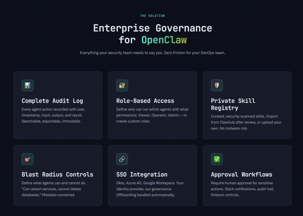 - Private skill registry — curated, malware-scanned repository replacing the public ClawHub free-for-all