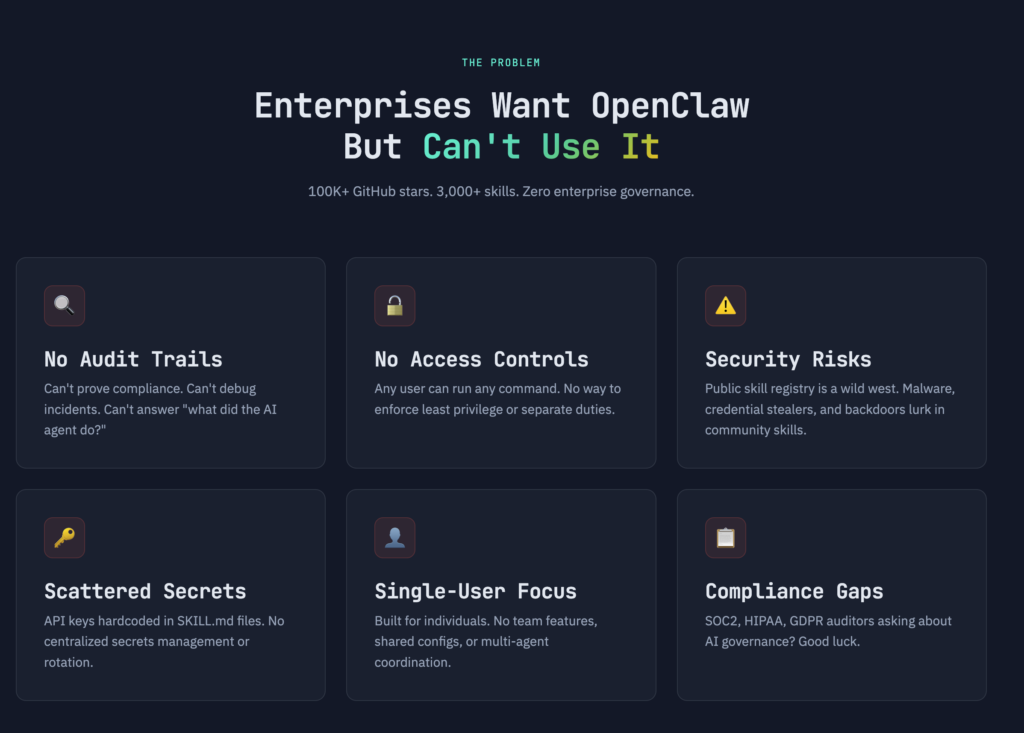The solution is a governance layer that wraps OpenClaw — adding enterprise capabilities without sacrificing the flexibility that developers love.