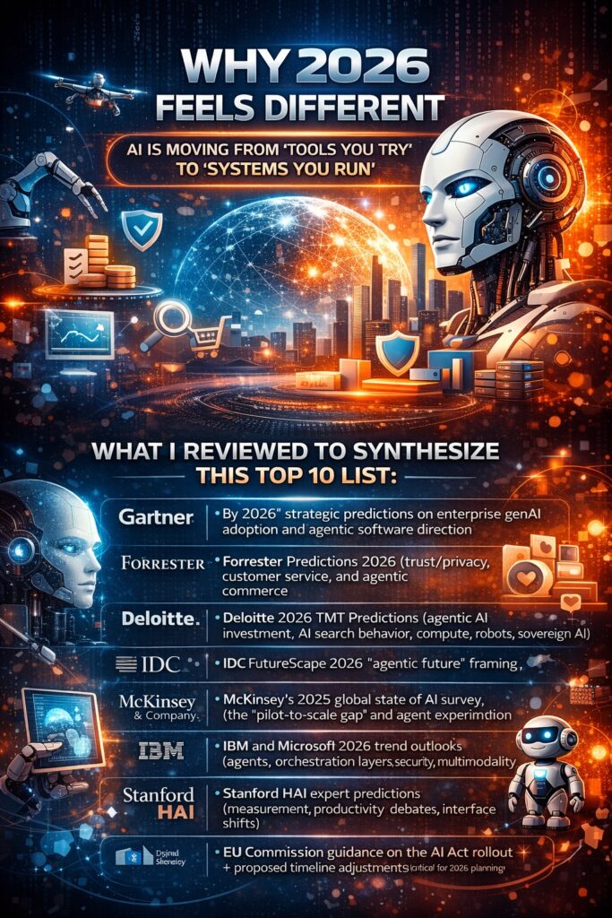 Across analyst houses and industry forecasts, one theme repeats: AI is moving from “tools you try” to “systems you run.” 2026 is framed as a year where agentic AI becomes operational, budgets consolidate around measurable value, and regulation/security force more disciplined deployment — while consumer behavior shifts toward AI-mediated search, shopping, and even relationships.