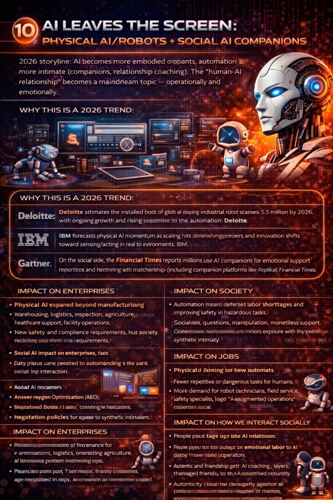 10) AI leaves the screen: physical AI/robots + social AI companions