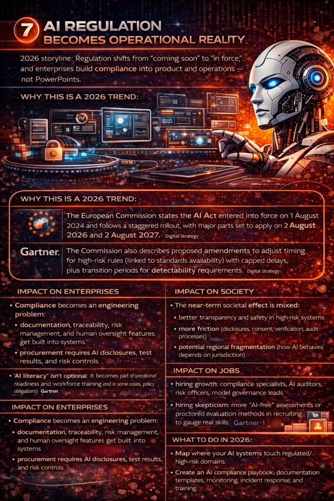 - AI regulation becomes operational reality (EU AI Act + accountability + “AI-free” assessments)