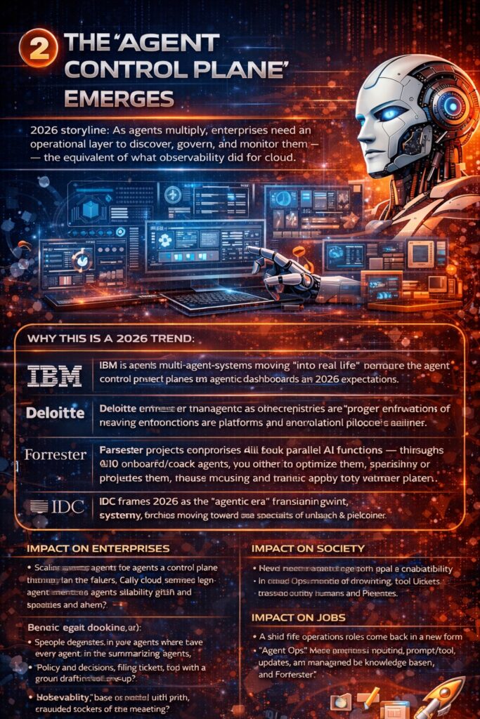 - IBM forecasts multi-agent systems moving “into real life,” highlighting agent control planes and multi-agent dashboards as a 2026 expectation. IBM+1