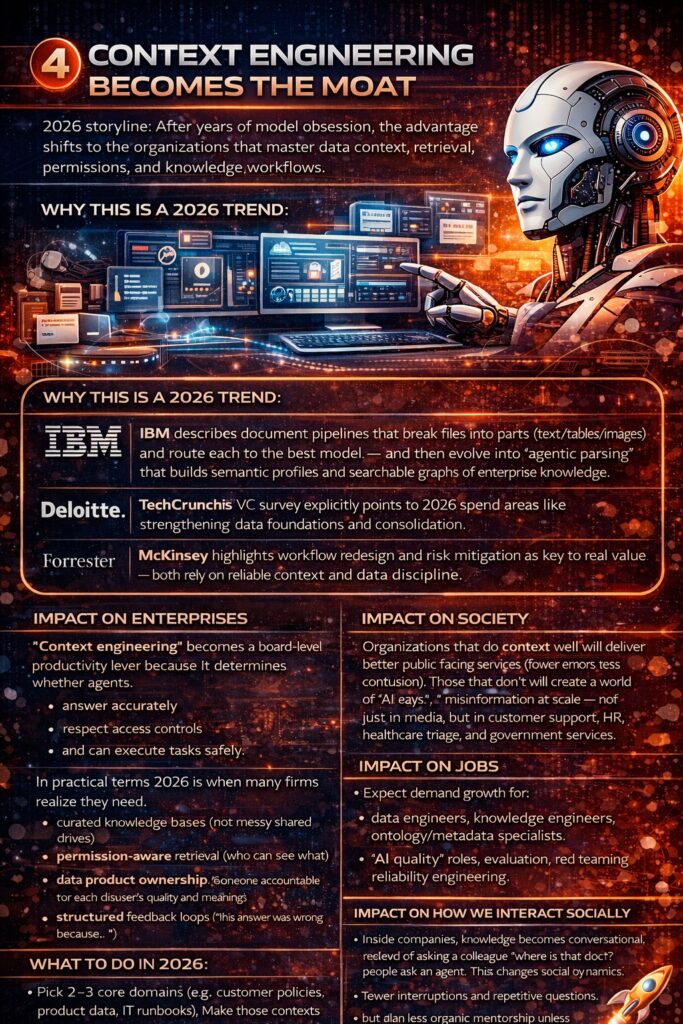 - Context engineering becomes the moat (enterprise data readiness finally matters)