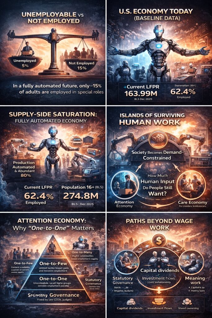 In a “post-labor” world with a solid income floor (capital dividends, social wealth funds, or transfers), many people would be not employed by choice, not “unemployable” by capability.