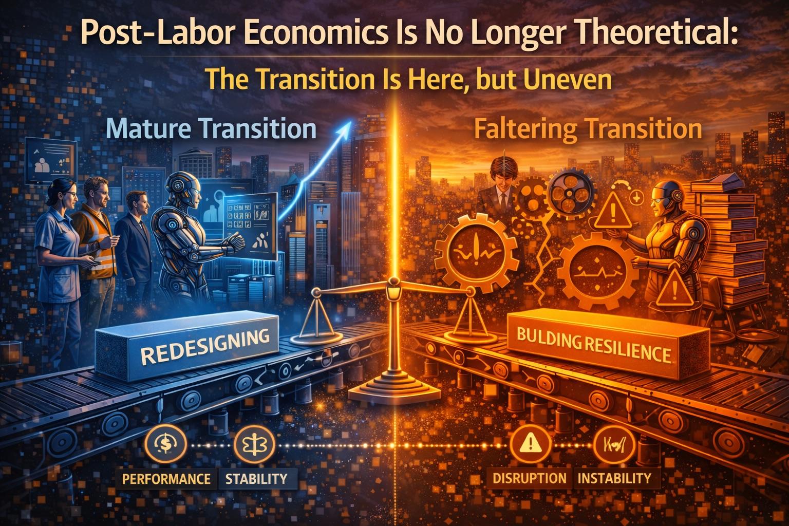 Post-labor economics is no longer theoretical. The transition is here — visible in entry-level hiring compression, in the gap between micro task gains and macro productivity stagnation, in the widening split between labour share and corporate profits. The question is not whether the transition is happening. It is whether institutions — corporate, governmental, and social — will manage it toward broad-based improvement or allow it to concentrate gains in ways that undermine the demand base, the social contract, and the political stability that productivity growth ultimately depends on.