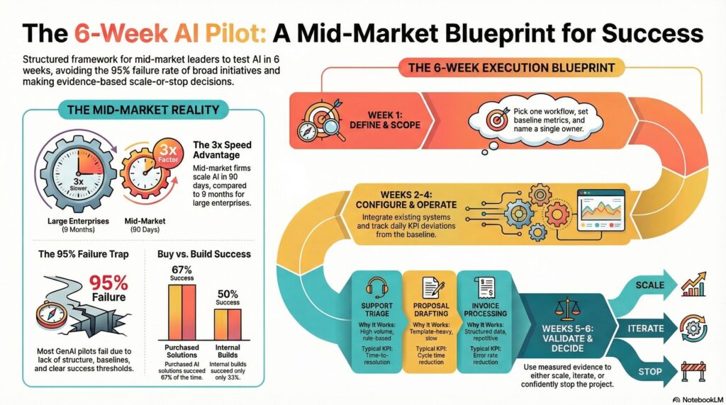 This article is a 6-week blueprint for mid-market AI pilots that produce scale-or-stop decisions backed by evidence, not enthusiasm.