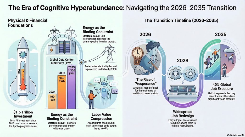 At Thorsten Meyer AI, we use “cognitive hyperabundance” to mean a near-term regime shift in which high-quality cognitive outputs—drafts, analyses, code, designs, planning artifacts, synthesis, and decision support—become widely available at marginal costs that approach “effectively free” for many use cases. This shift is driven by two coupled curves: accelerating model capability (software) and accelerating AI infrastructure buildout (hardware, data centers, power, and cooling). Evidence from 2024–2026 strongly supports the infrastructure half of the thesis—capital formation and energy procurement are scaling at “mega-project” magnitudes—while the labor-market half is best described as rapid task reconfiguration and value compression rather than immediate “human knowledge work goes to zero.” [1]