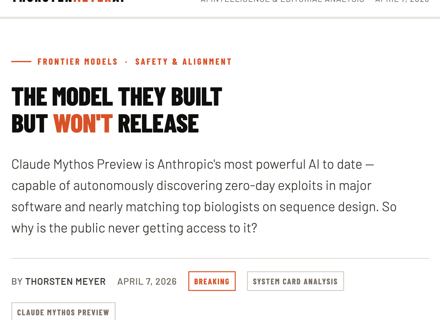 © 2026 ThorstenmeyerAI.com — AI Intelligence & Editorial Analysis Analysis based on Anthropic’s Claude Mythos Preview System Card, April 7, 2026